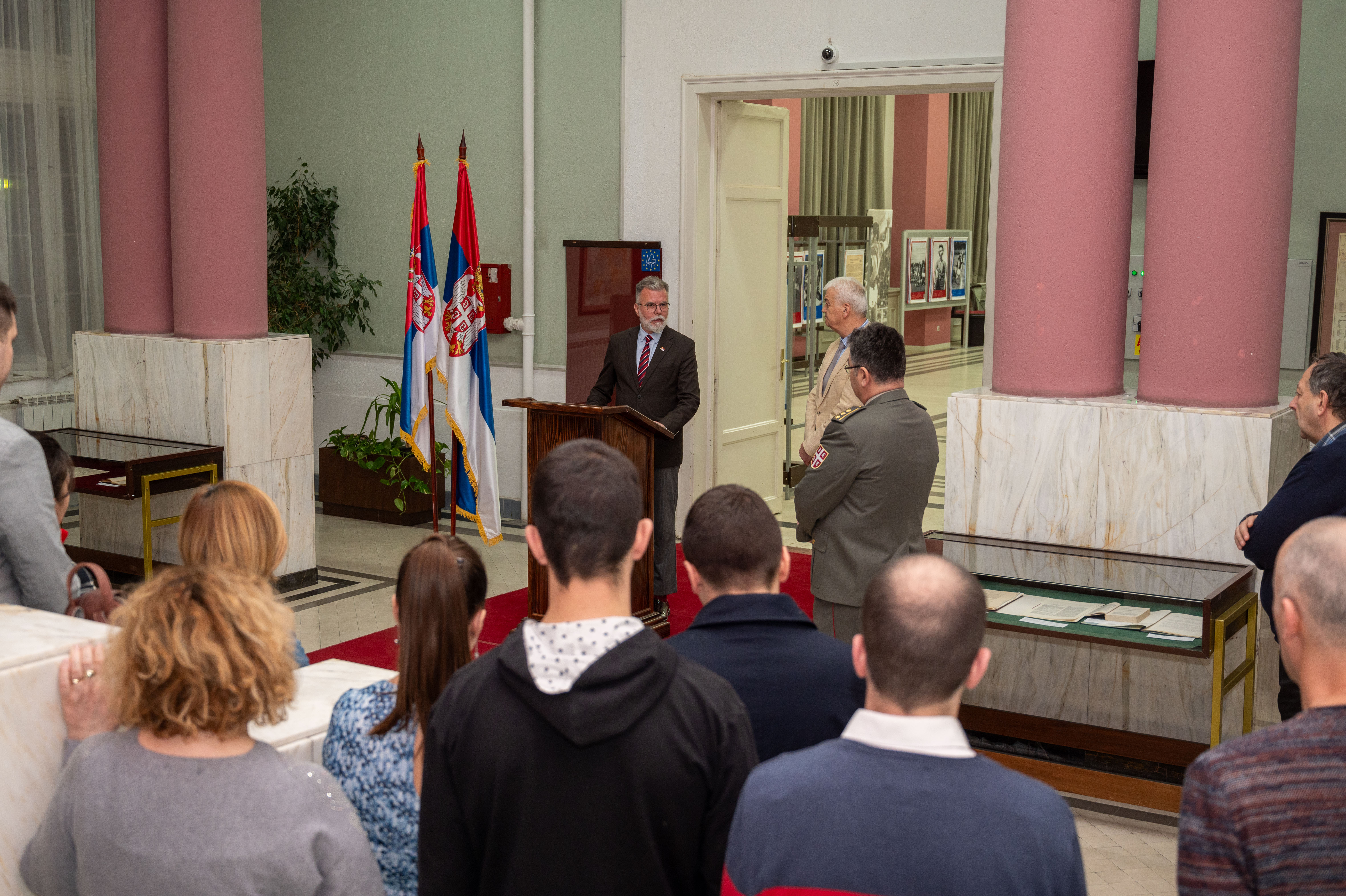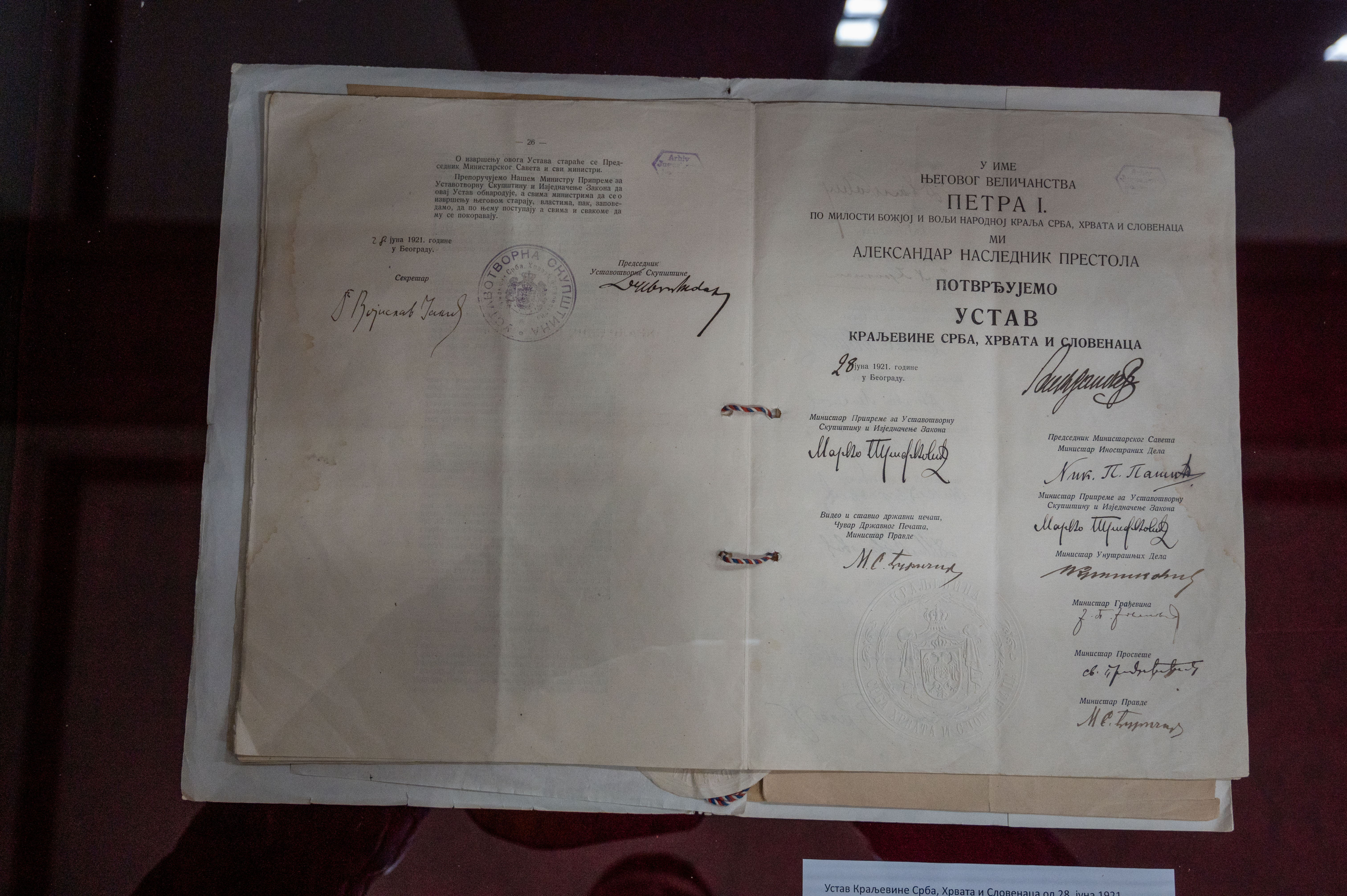 „Пред нама се налазе сведоци уставне историје Југославије који сведоче о њеном трајању од 1918. до 2006. године. Југословенска идеја, иако по својој природи племенита, донела је српском народу и његовој држави бројне изазове и искушења. Сам чин стварања југословенске државе представљао је истовремено и моменат потпуног поништавања државности Краљевине Србије. Током 88 година свога трајања у различитим друштвеним уређењима и под различитим називима, југословенска држава из корена је променила мапу средишњег Балкана и југоисточне Европе. Стварајући државу Јужних Словена наши славни преци, овенчаним победом у Првом светском рату, означили су почетак једне по много чему јединствене етапе у националној историји. И мада се већина Срба по први пут у својој историји тада нашла унутар граница сопствене државе, југословенско искуство донело је нашем народу, поред осталог, безмерна страдања, посебно она током Другог светског рата“, рекао је министар.